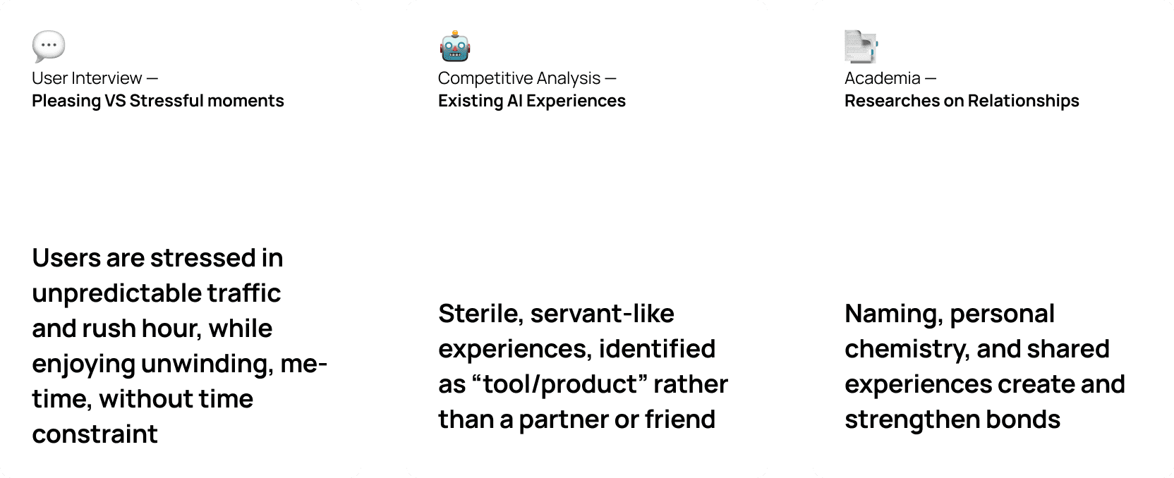 The design direction was grounded in three layers of research — driver experience insights, competitive AI analysis, and relationship-building studies — which together pointed toward a single guiding concept: AI as a friend. Rather than a servant that simply responds on command, the vision was a proactive companion that knows you, shaped by the understanding that naming, personality, and shared experiences are what make relationships feel real.
