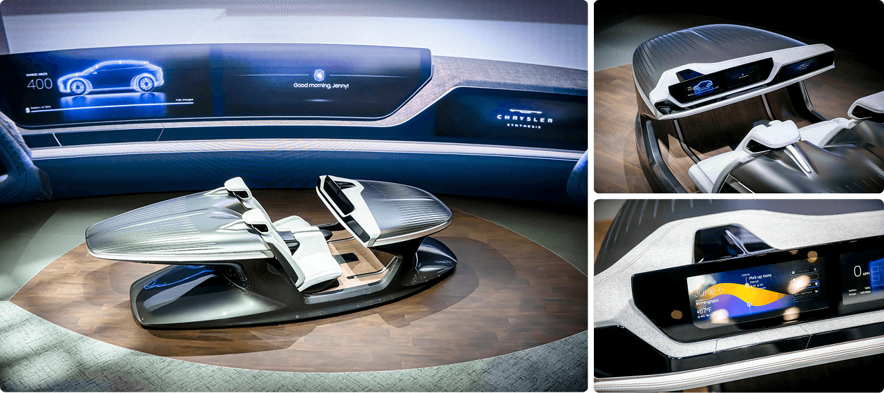 Synthesis is Chrysler's concept car, presented at CES 2023, exploring how charging and driving data can be visualized clearly across a multi-screen in-car experience.